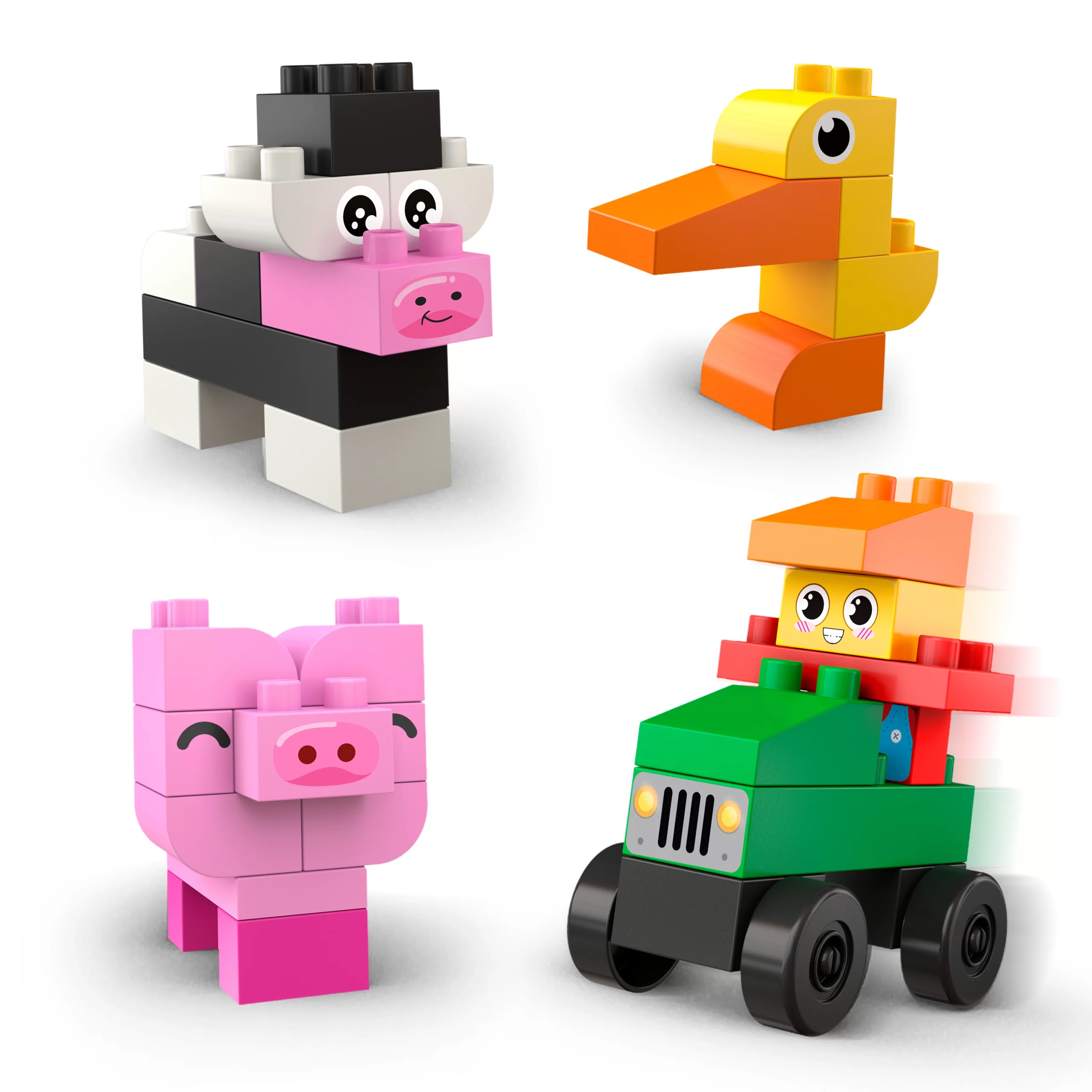 Con Blokoco Granja podés armar una vaca, un cerdito, un pato y hasta un tractor para recorrer el campo.